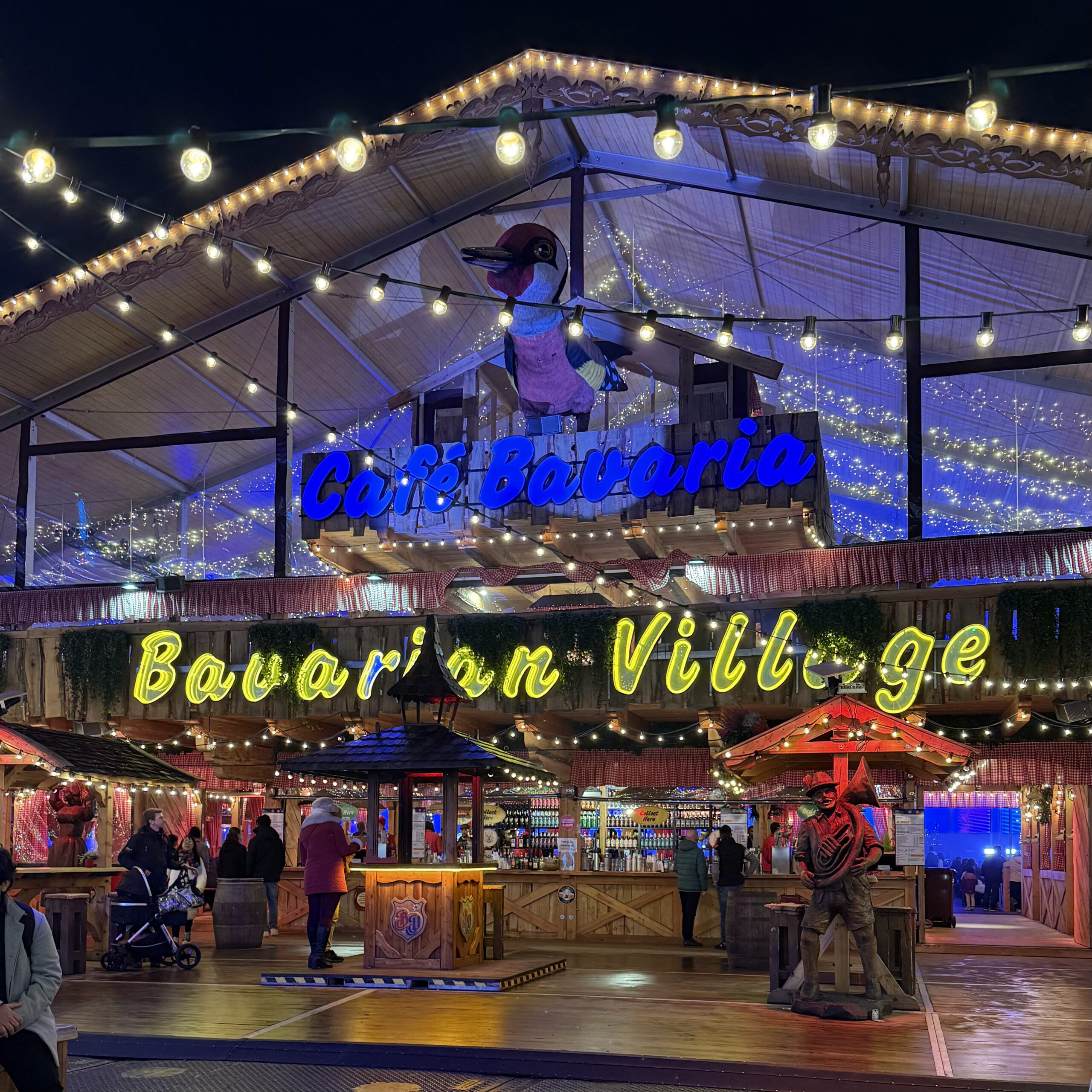 We entered through the red gate in Santa Land and made our way toward Luminaire Lane, stopping for photos beneath the illuminated archway and to admire the rotating bar at the center of the square. From there, we followed a pretzel sign straight into Bavarian Village, where large beer halls offered food, drinks, and live music. As we wandered, we passed carnival-style games, rides, and countless food stalls, along with Market Square vendors selling gifts and souvenirs. Nothing felt overly crowded, making it an easy and enjoyable place to explore at a relaxed pace.