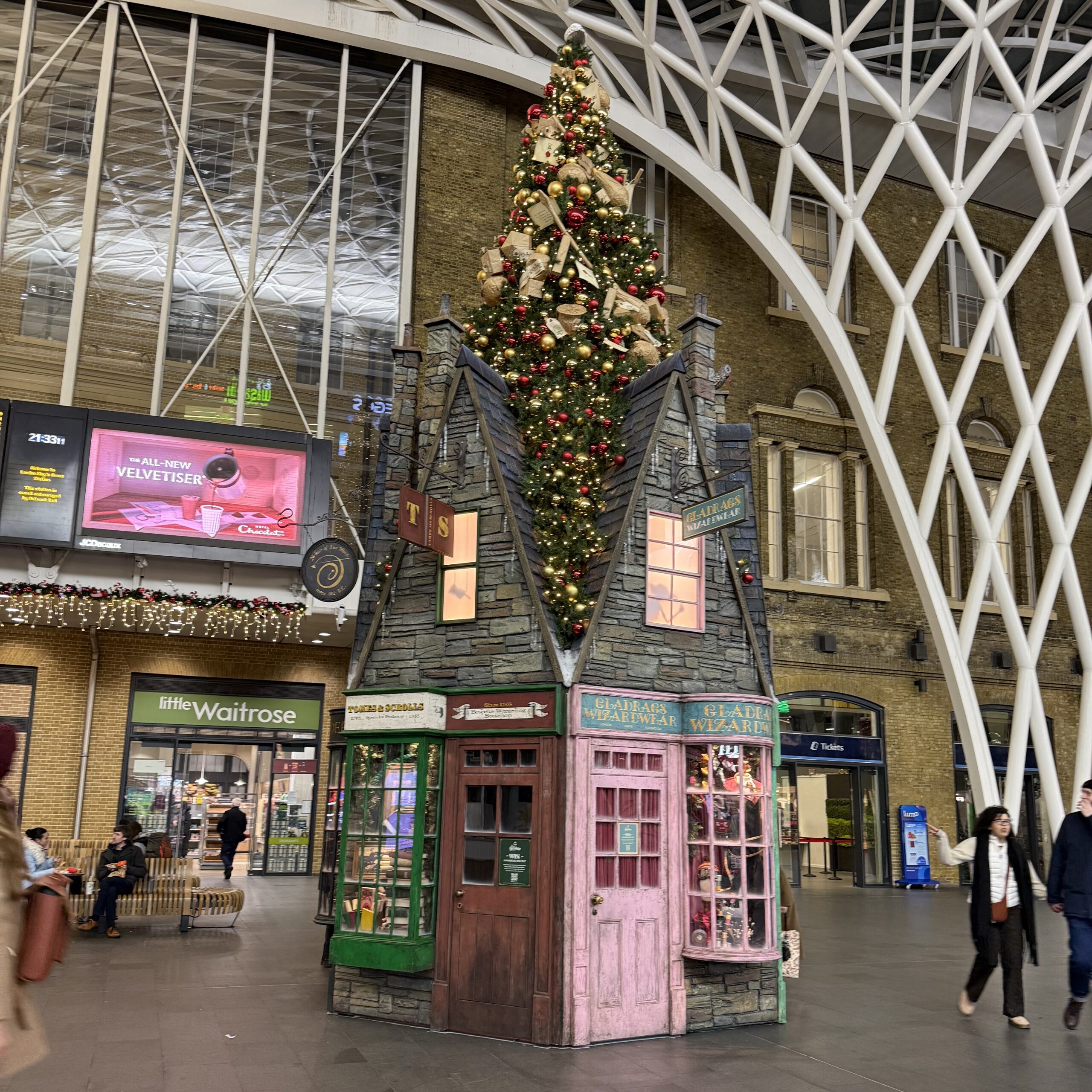 Finally, we headed to Dishoom for our first real meal of the day – and boy was it worth the wait. We headed back up the Piccadilly line to King Cross station and walked north to the Dishoom King’s Cross location. This was my second time dining at that location and it was just as good as I remembered it. On our way back towards the hotel, we stopped inside of King’s Cross to see Platform 9 3/4. The line for the photo opportunity was long, but it was fun to watch a few people get their photo taken. We also enjoyed the mini diagon-alley-turned-christmas-tree display nearby.